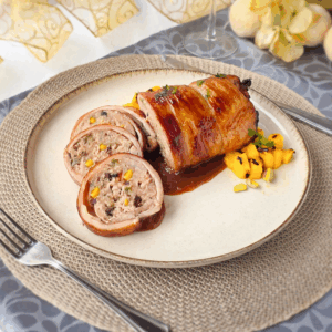 Marinated Iberian pork secret stuffed with minced Iberian pork, mango, pistachios, pine nuts, leek, raisins and muscat wine.