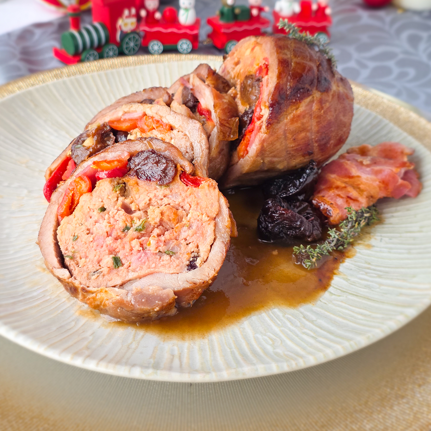 Marinated pork needle stuffed with minced pork and beef (burger meat), bacon, red pepper, prunes and pine nuts.