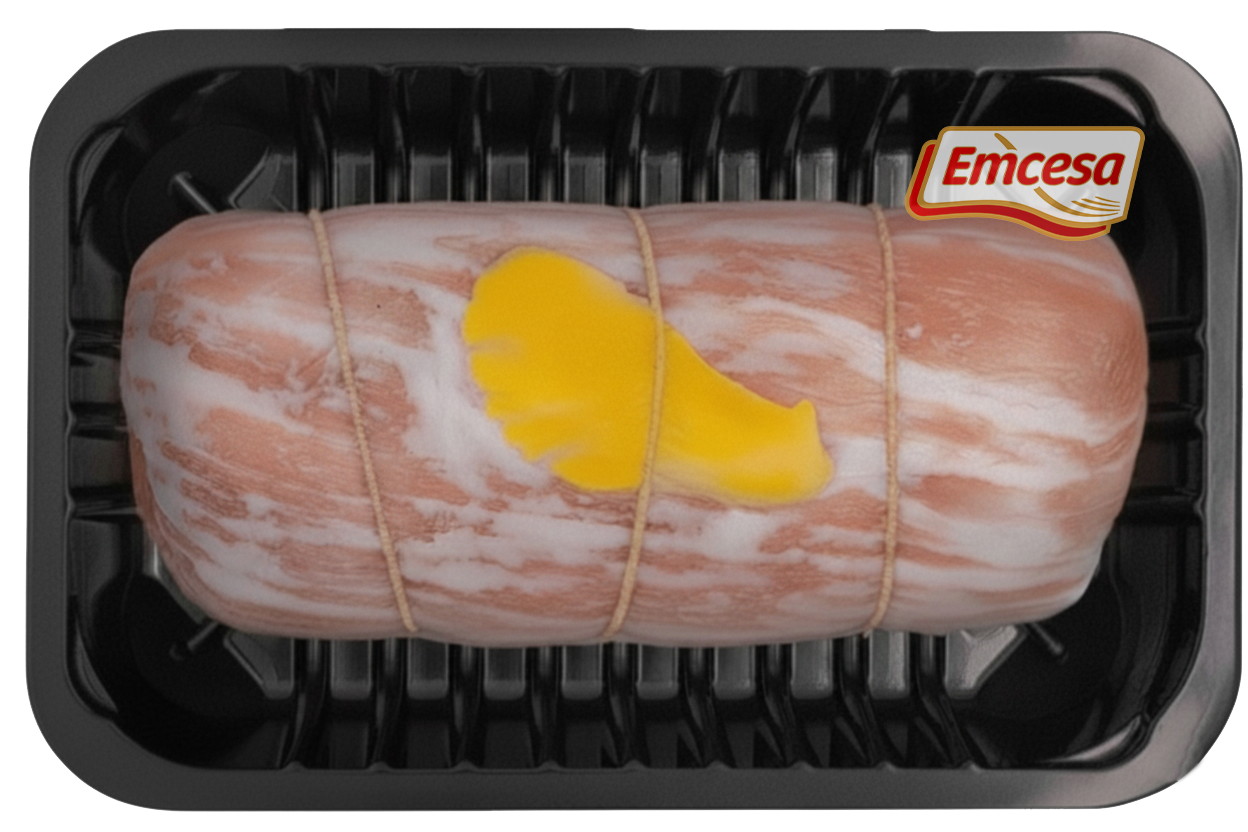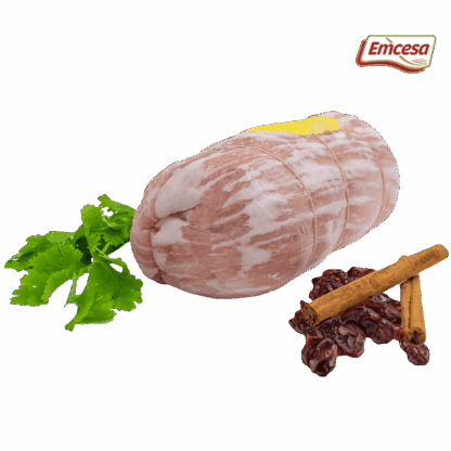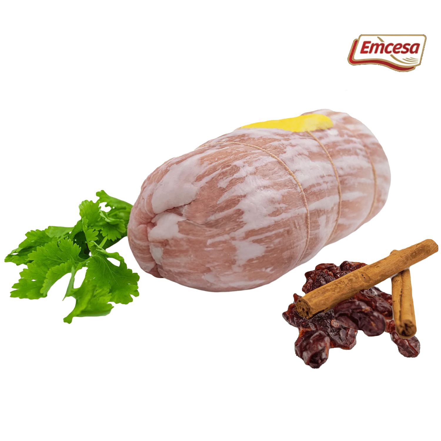 Secreto de cerdo ibérico marinado relleno de carne picada de cerdo ibérico, mango, pistachos, piñones, puerro, uvas pasas y vino moscatel.