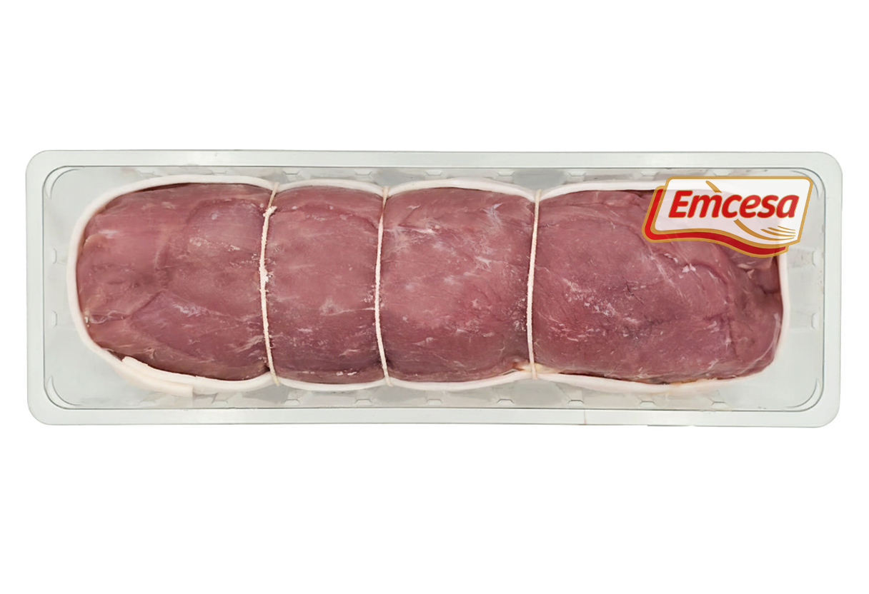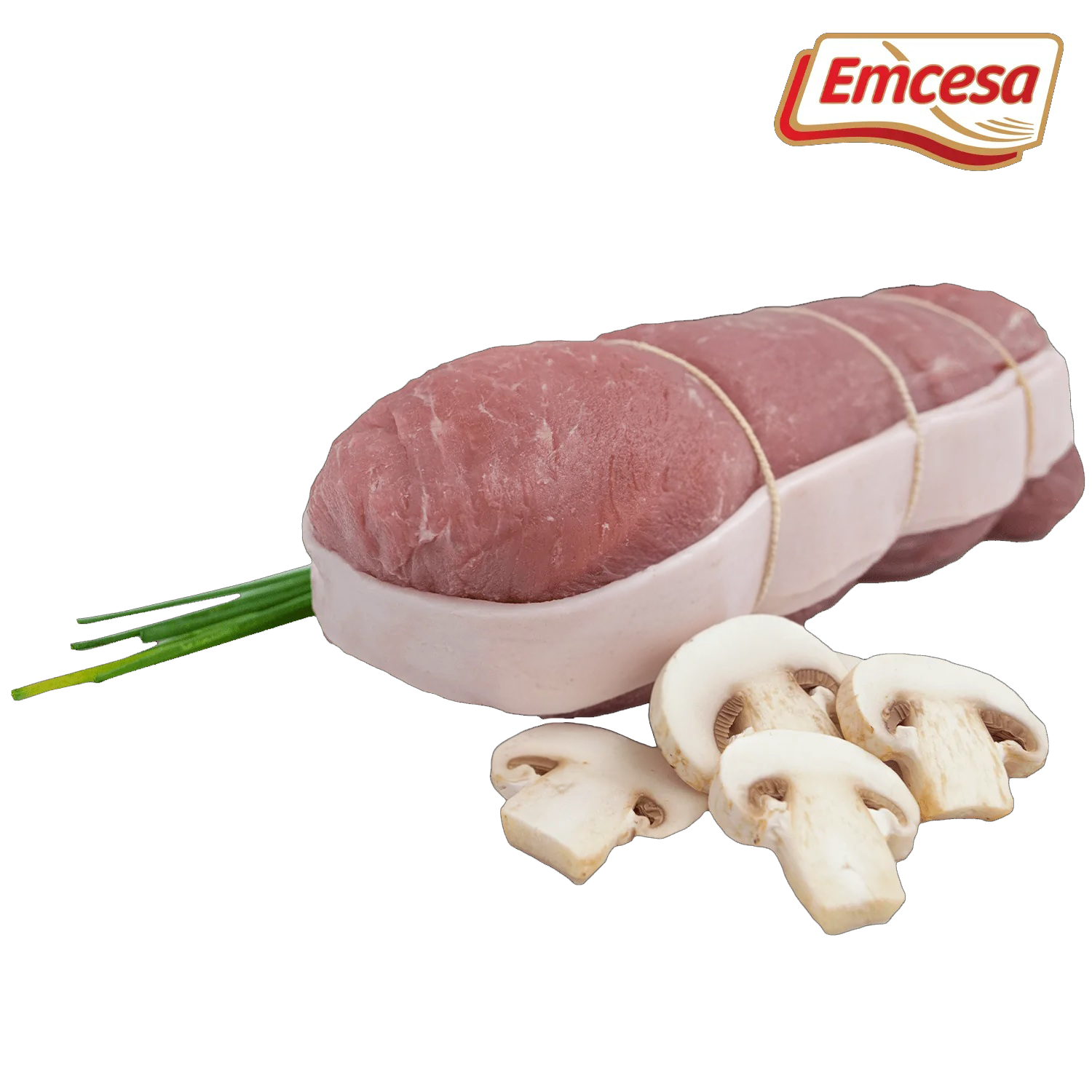 Solomillo de cerdo marinado relleno de carne de cerdo picada (burger meat), boletus, uvas pasas y piñones. Albardado con tocino y decorado con champiñón.
